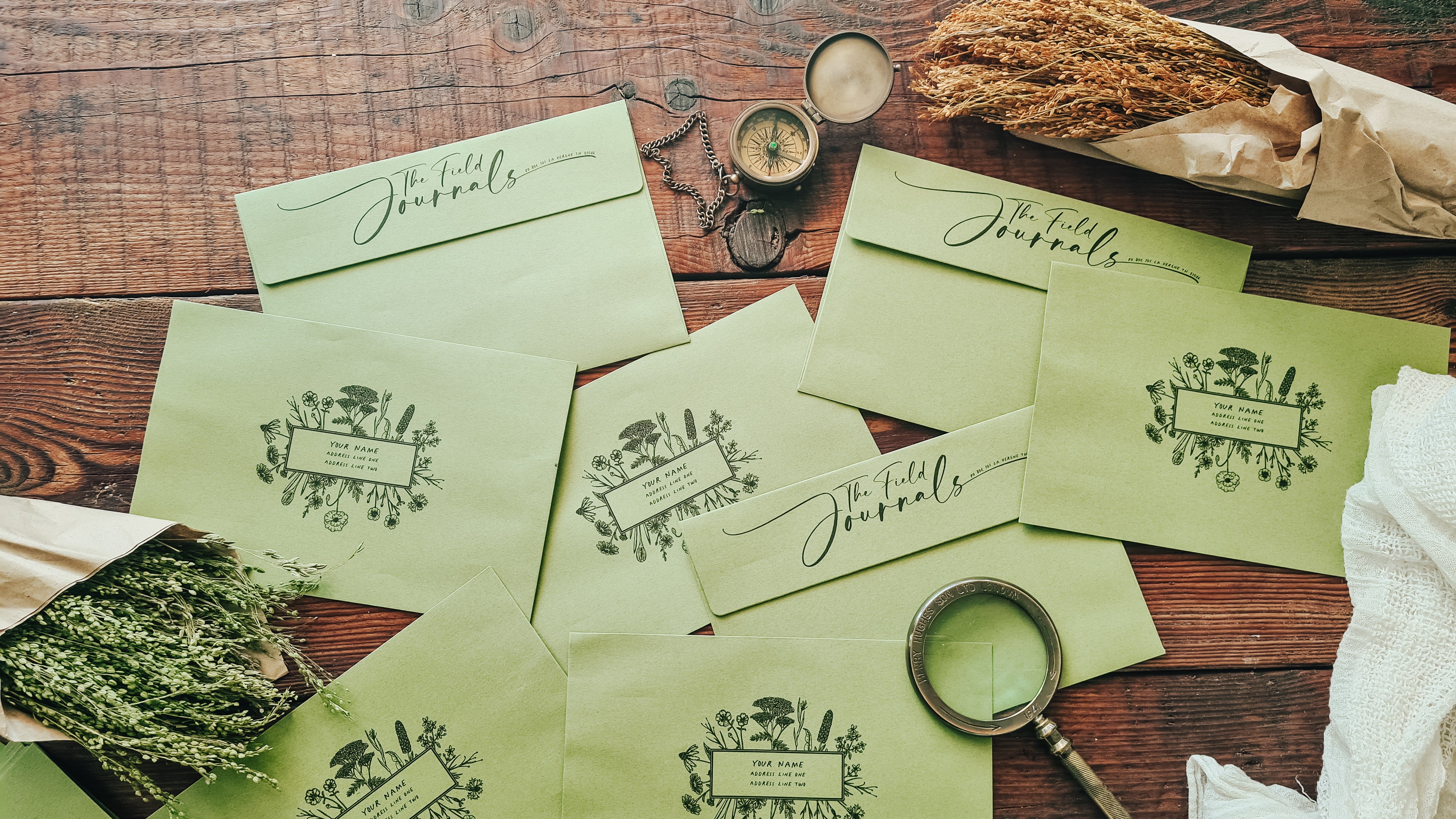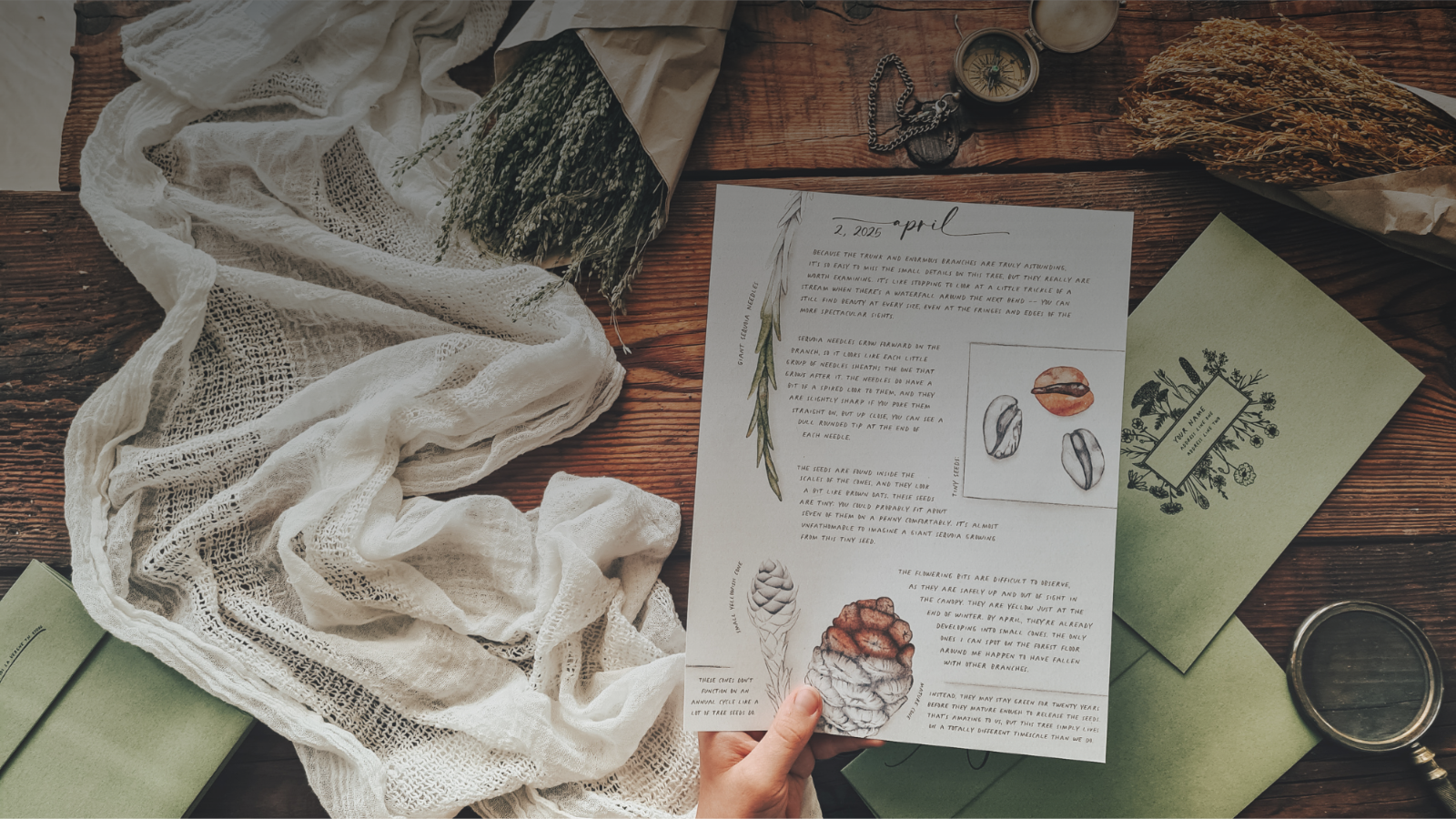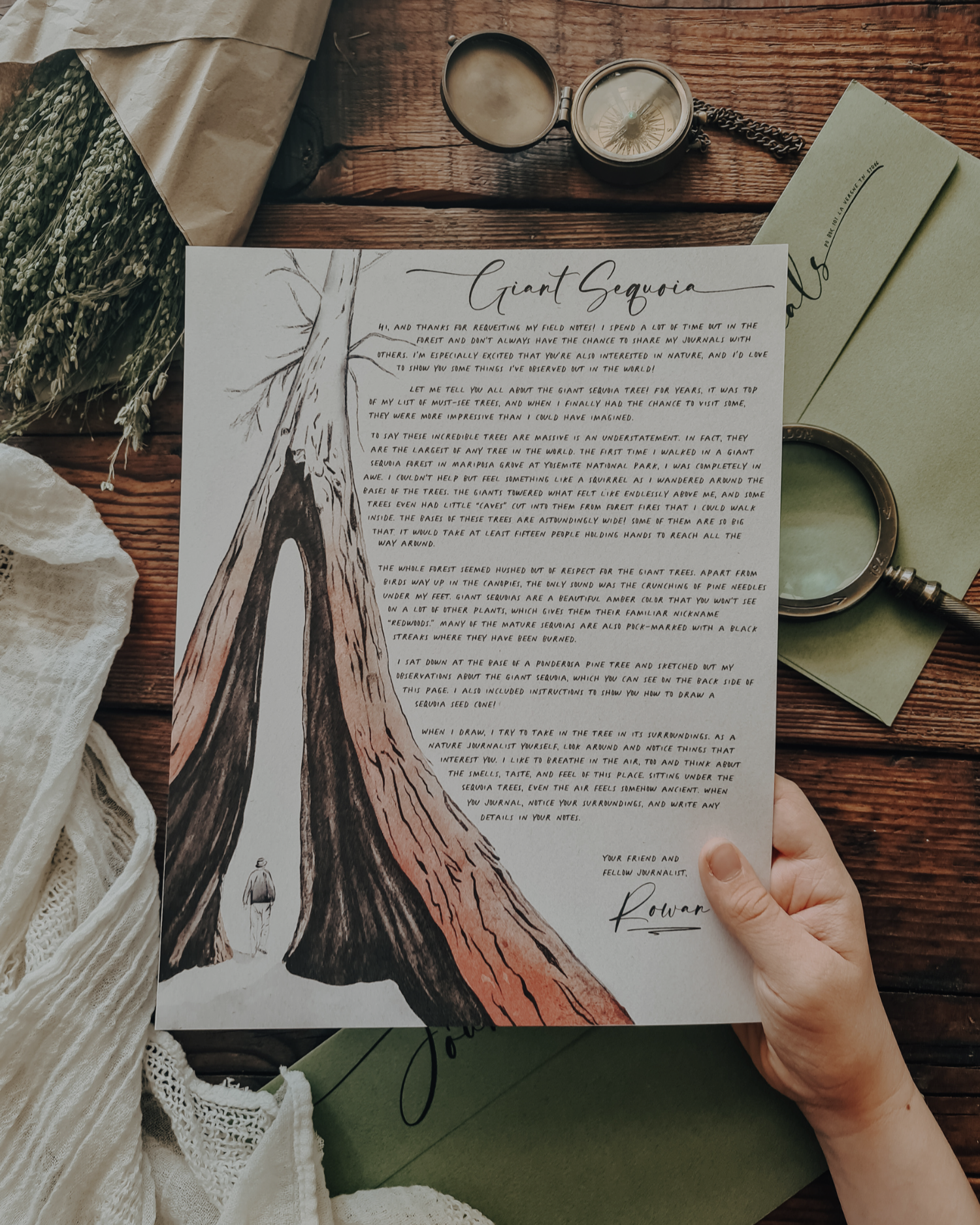 You'll receive a new letter every month from your friend and fellow field journalist, Rowan, who has spent some time walking, observing, and drawing the journal entry.